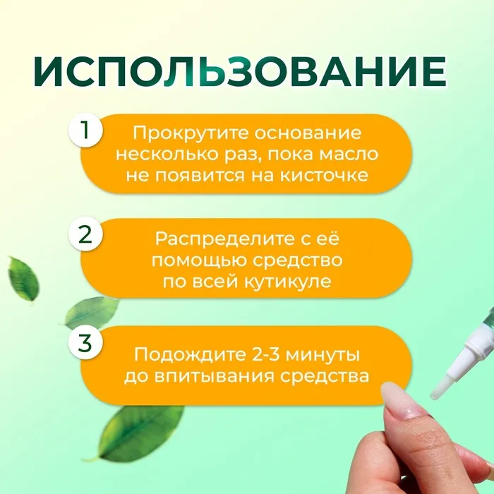 Способ применения: прокрутите основание несколько раз, пока масло не появится на кисточке. Распределите с её помощью средство по всей кутикуле. Подождите 2-3 минуты до впитывания средства. Вотрите остатки лёгкими массажными движениями.