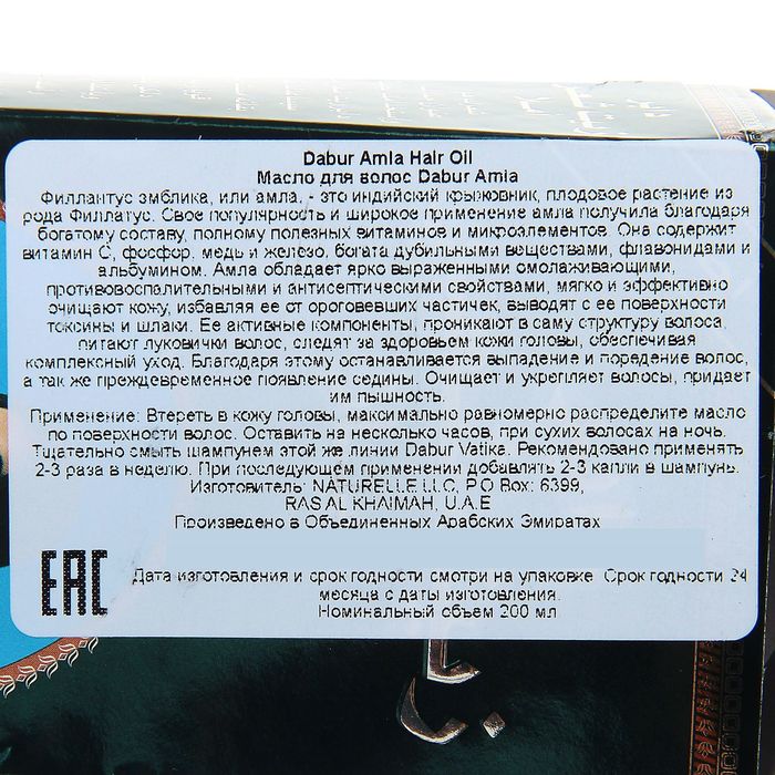Масло для волос Dabur AMLA Original, гладкость и прочность, 200 мл — Характеристики