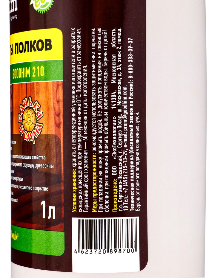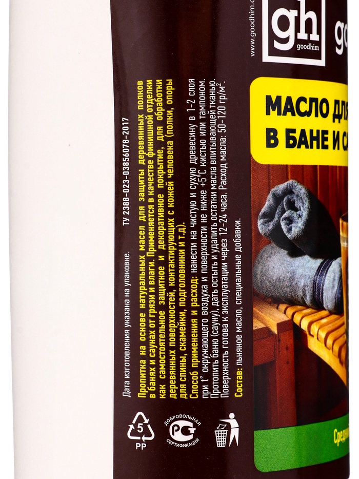 Масло Goodhim-210 предохраняет полки в банях и саунах от грязи и влаги. Применяется в качестве финишной отделки как самостоятельное защитное и декоративное покрытие и для обработки деревянных поверхностей, контактирующих с кожей человека.