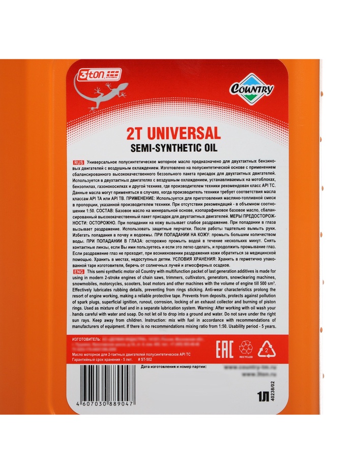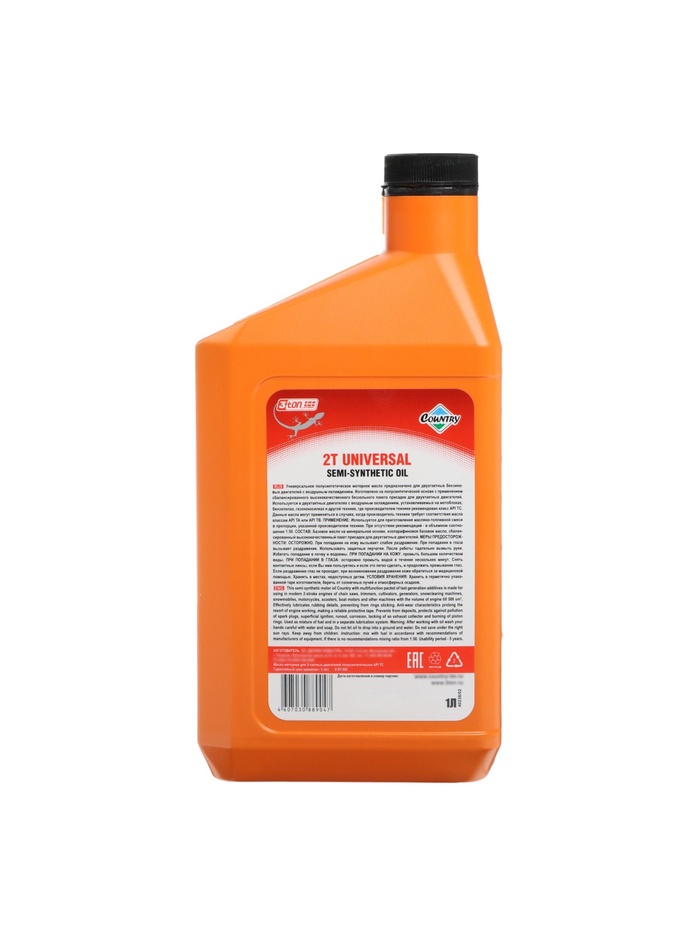 Масло двухтактное Country полусинтетическое API ТС, 1 л. Полусинтетическое моторное масло Country с добавлением многофункционального пакета присадок последнего поколения разработано для использования в современных двухтактных двигателях бензопил, триммеров, культиваторов, генераторов, снегоуборочных машин, снегоходов, мотоциклов, скутеров, лодочных моторов и другой техники с объемом двигателя до 500 см³. Эффективно смазывая трущиеся детали, предотвращает залипание колец. Противоизносные свойства продлевают ресурс работы двигателя, образуя надежную защитную пленку. Предотвращает от образования отложений, защищает от загрязнения свечей, поверхностного зажигания, износа, коррозии, забивания выхлопного коллектора и пригорания поршневых колец2704053)