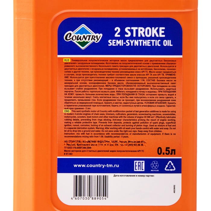 Полусинтетическое моторное масло Country с добавлением многофункционального пакета присадок последнего поколения разработано для использования в современных двухтактных двигателях бензопил, триммеров, культиваторов, генераторов, снегоуборочных машин, снегоходов, мотоциклов, скутеров, лодочных моторов и другой техники с объемом двигателя до 500 см³. Эффективно смазывая трущиеся детали, предотвращает залипание колец. Противоизносные свойства продлевают ресурс работы двигателя, образуя надежную защитную пленку. Предотвращает от образования отложений, защищает от загрязнения свечей, поверхностного зажигания, износа, коррозии, забивания выхлопного коллектора и пригорания поршневых колец.