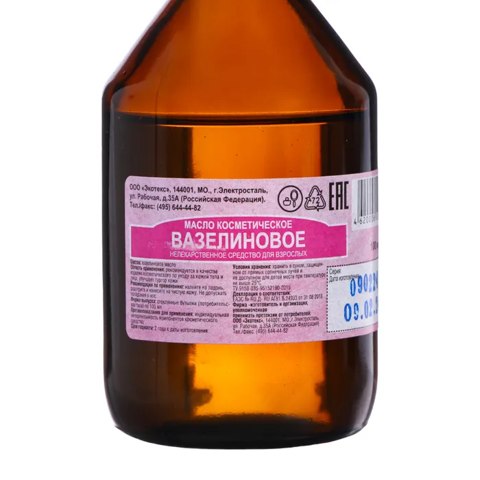 Масло косметическое вазелиновое Экотекс смягчает огрубевшие участки кожи, глубоко увлажняет, способствует росту ресниц и бровей, подходит для ухода за секущимися кончиками волос.