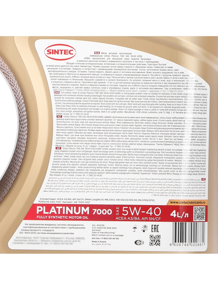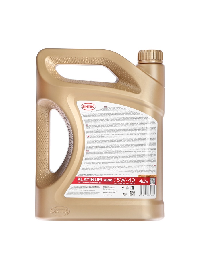 Масло моторное Sintec Platinum 7000 5W-40, SN/CF, синтетическое, 801941/600139, 4 л — Характеристики