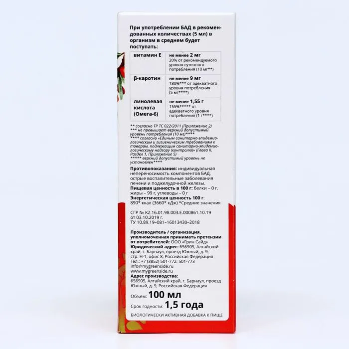 Назначение: рекомендуется в качестве биологически активной добавки к пище – дополнительного источника витамина Е, каротиноидов, полиненасыщенных жирных кислот омега-6, стимулирующей восстановление кожи и слизистых оболочек, оказывающей общеукрепляющее и антиоксидантное действия.