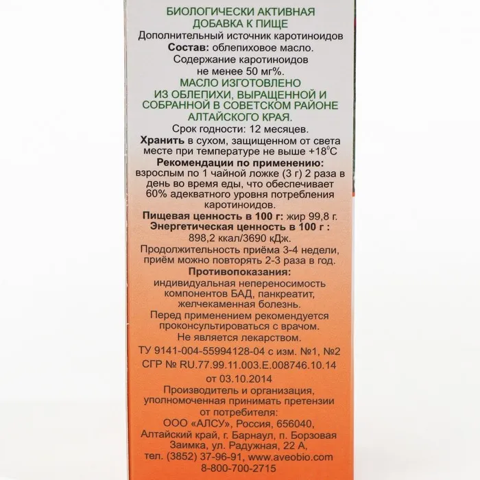 Состав: облепиховое масло. Содержание каротинойдов не менее 50 мг %