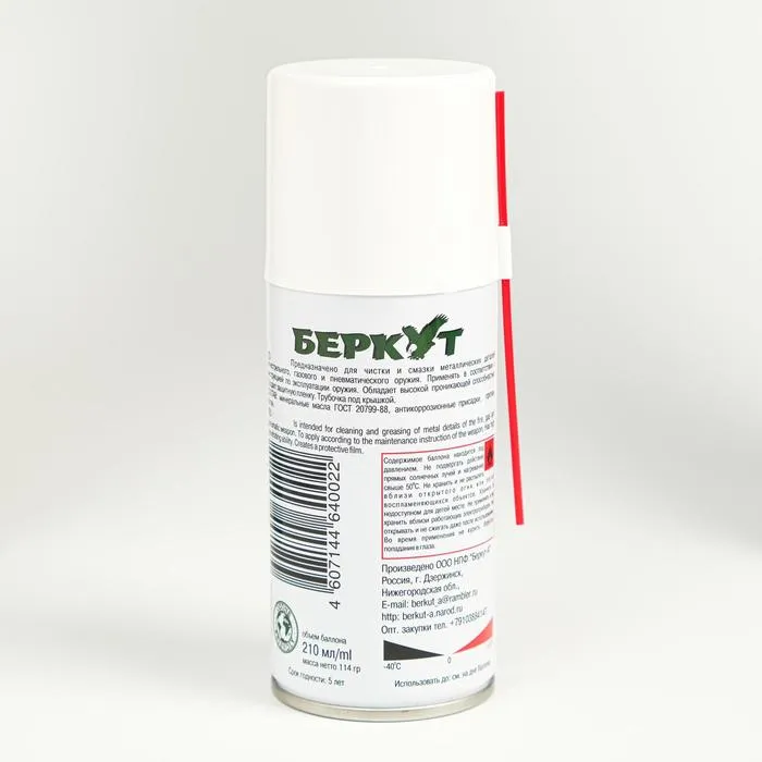 Масло оружейное нейтральное «Беркут» применяется для смазки канала ствола, поршневого механизма и направляющих в пневматических винтовках. Продлевает срок службы и улучшает боевые характеристики. Упаковка – баллон с распылителем объемом 210 мл.