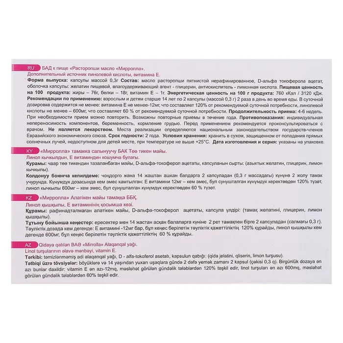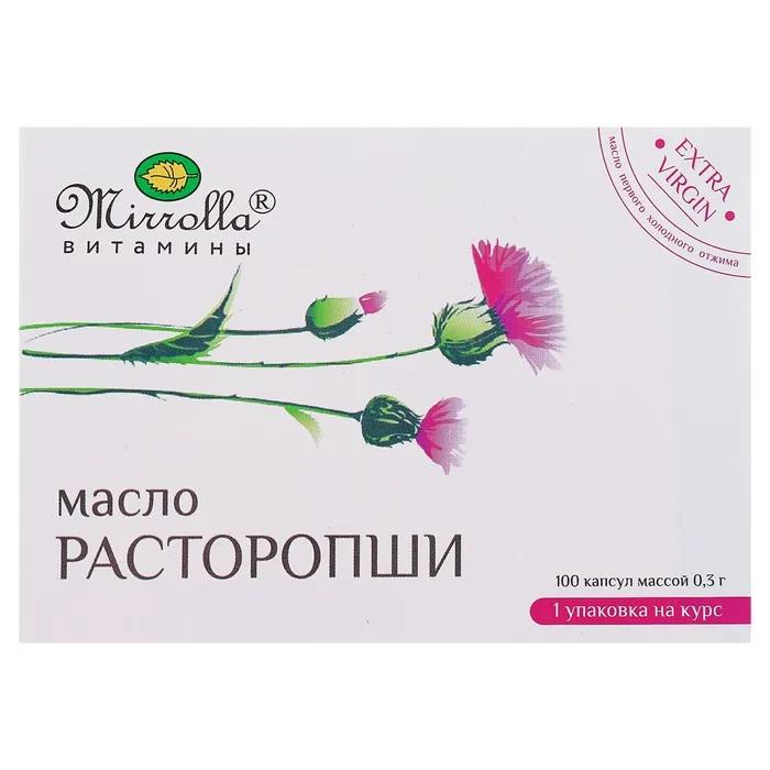 Состав: масло расторопши пятнистой нерафинированное, оболочка капсулы: желатин пищевой, влагоудерживающий агент - глицерин, антиокислитель - лимонная кислота, D-альфа токоферола ацетат.