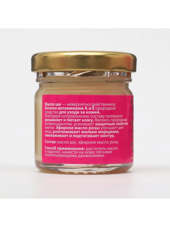 Масло ши — невероятно действенное, богатое витаминами А и Е природное средство для ухода за кожей. Благодаря натуральному составу прекрасно увлажняет и питает кожу. Являясь природным антиоксидантом, усиливает защитные свойства клеток. Эфирное масло розы улучшает цвет лица, разглаживает мелкие морщинки, омолаживает и подтягивает контур.