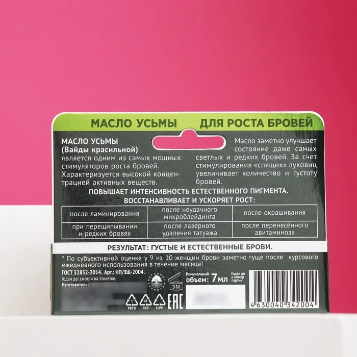 Масло усьмы (Вайды красильной) для роста бровей - действенное средство, стимулирующее бровей. Благодаря высокой концентрации активных веществ в составе масла, продукт заметно улучшает состояние даже самых светлых и редких бровей. Эффективно восстанавливает брови после ламинирования и окрашивания. Идеально подходит, как для ускорения процесса отращивания бровей после перещипывания, так и для усиления природной густоты и блеска.
