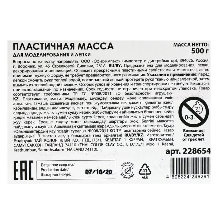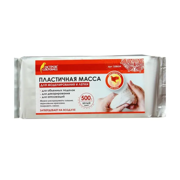 Паста (масса) ОСТРОВ СОКРОВИЩ для моделирования и лепки отлично подойдет для лепки дома, в школе, художественных студиях и для профессионального использования. Предназначена для изготовления объемных поделок, декорирования, аппликаций. Масса для моделирования и лепки схожа по своим качествам с глиной. Отличается легкостью в работе: очень мягкая и пластичная, имеет приятный запах, не липнет к рукам, не требует тепловой обработки, затвердевает на воздухе в течение 12 часов.Масса для лепки ОСТРОВ СОКРОВИЩ белого цвета фасовкой 500 г упакована в герметичную фольгированную упаковку, что позволяет хранить товар в течение длительного времени. Масса очень податлива: моделируется руками, пластична, легко лепится, раскатывается, режется, принимает любую форму. При необходимости можно использовать инструменты. Чтобы избежать появление трещин на изделии после застывания, необходимо работать с массой влажными руками. Затвердевает на воздухе, после высыхания становится очень прочной, не усаживается.Готовое изделие можно расписывать красками и декорировать в различных техниках. Хранить массу необходимо в герметичной емкости. Перед началом работы необходимо смочить руки в теплой воде и размять массу мокрыми руками. В процессе лепки для размягчения массы можно использовать воду.Основной состав: целлюлозное волокно, вода, гидроксильный полимер, красящие пигменты.