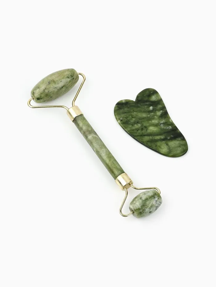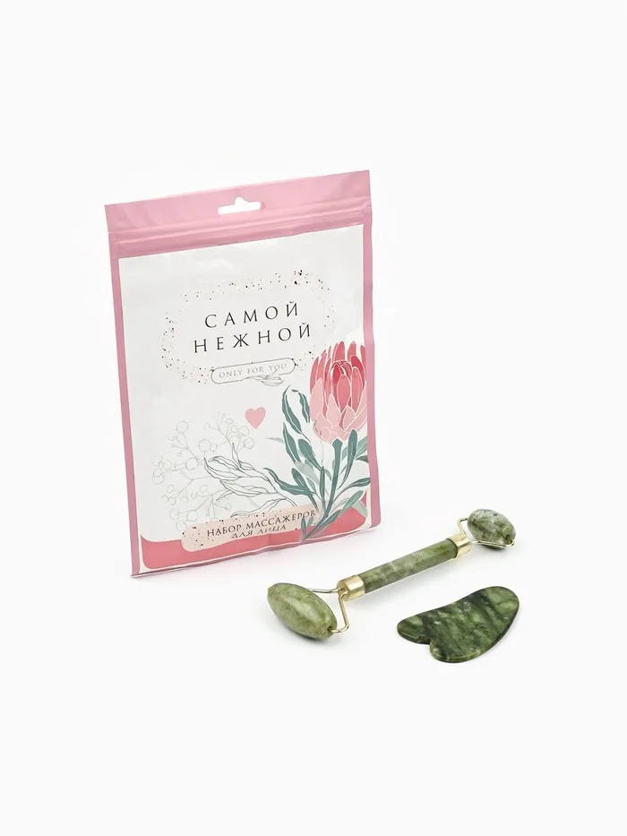 Набор с массажёрами для лица и зоны декольте поможет держать ваше тело в тонусе. В набор входит роликовый массажёр из кальцита и серпентина и массажёр гуаша.
