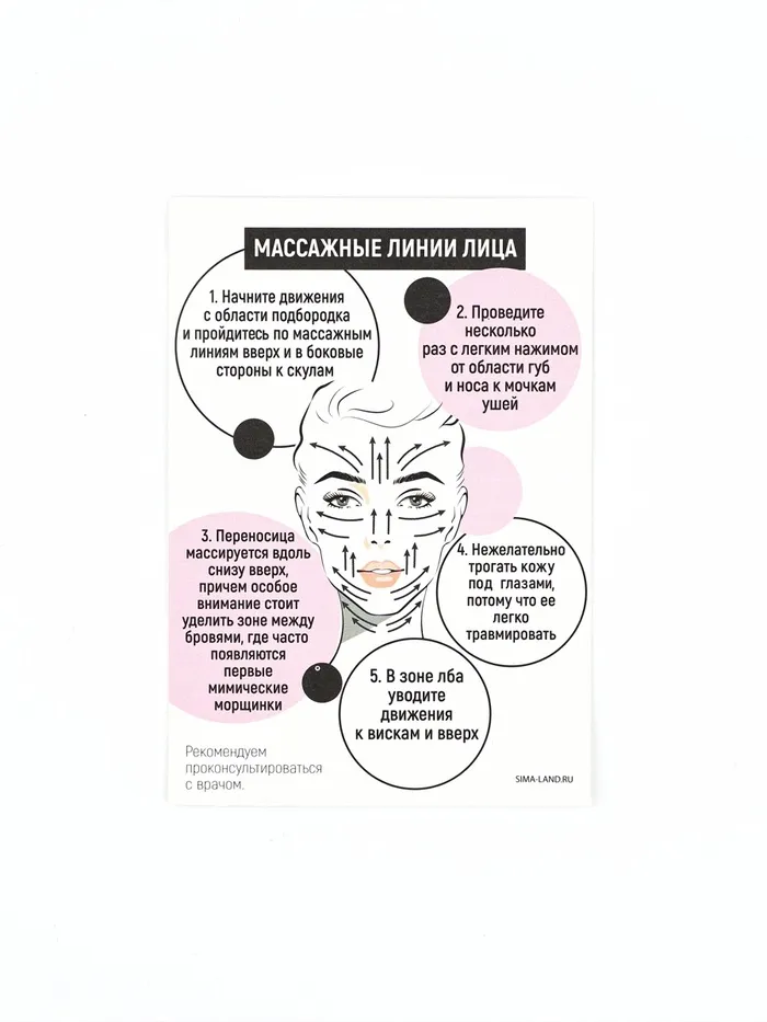 Способ применения: очистите лицо, нанесите увлажняющую сыворотку или масло. Возьмите массажёр и начните мягко нажимать на него. Двигайтесь по массажным линиям по 3 раза.