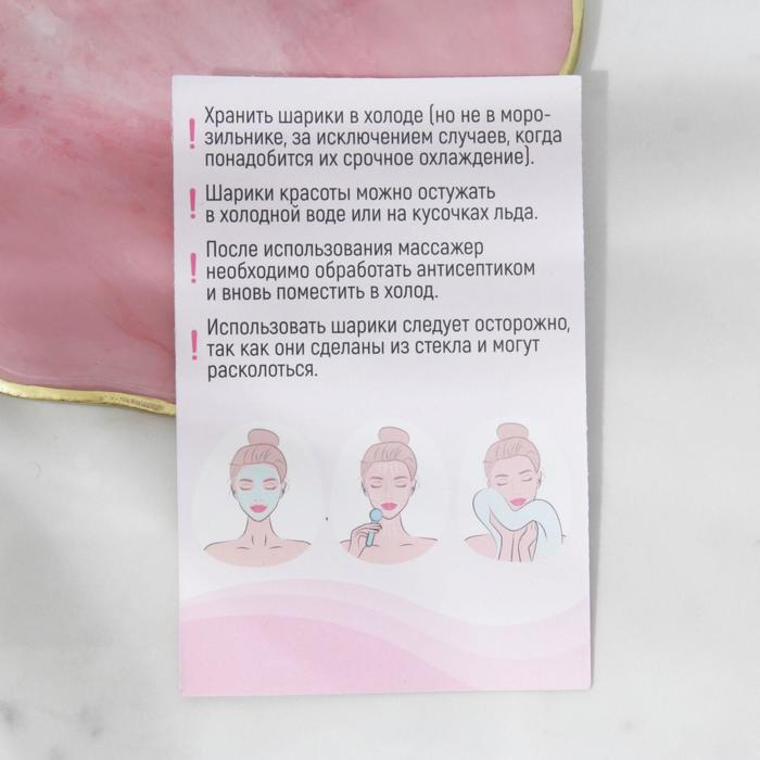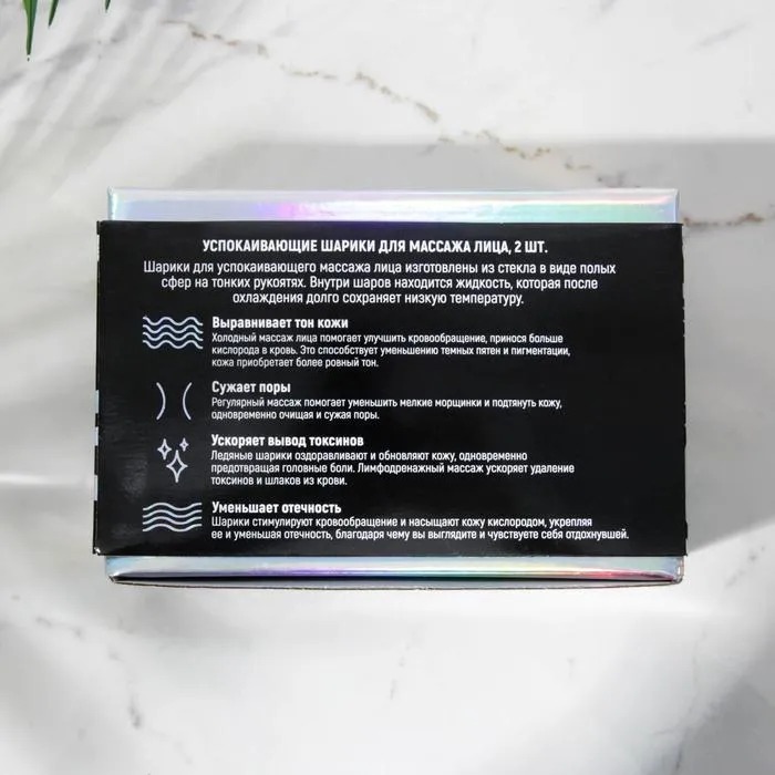 В набор входят криосферы, которые активно стимулируют кровообращение, охлаждают и насыщают ткани кислородом. Шары для успокаивающего массажа лица изготовлены из стекла в виде полых сфер на тонких рукоятках. Внутри шаров находится жидкость: "гидрозоль", которая после охлаждения долго сохраняет низкую температуру.