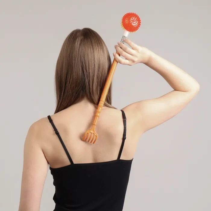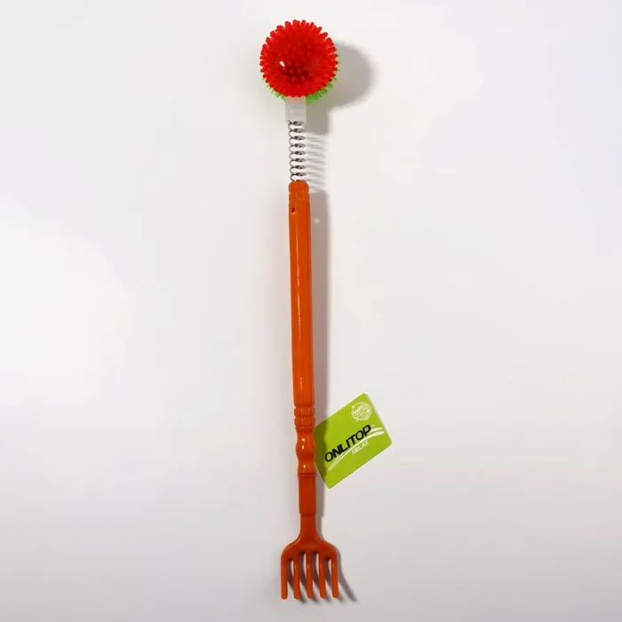 Двусторонний инструмент сделает массаж спины лёгким и приятным. Благодаря длинной ручке вы доберётесь до труднодоступных мест. Чесалка бережно снимет напряжение с мышц. Шарик на пружине предназначен для точечного поколачивающего массажа.