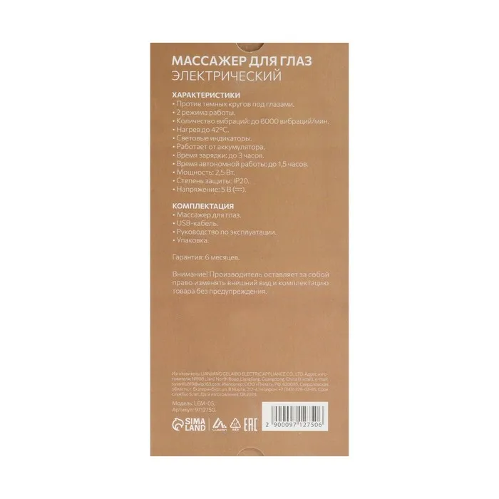 Массажёр для глаз Luazon LEM-05, 2.5 Вт, против темных кругов под глазами, АКБ — Характеристики