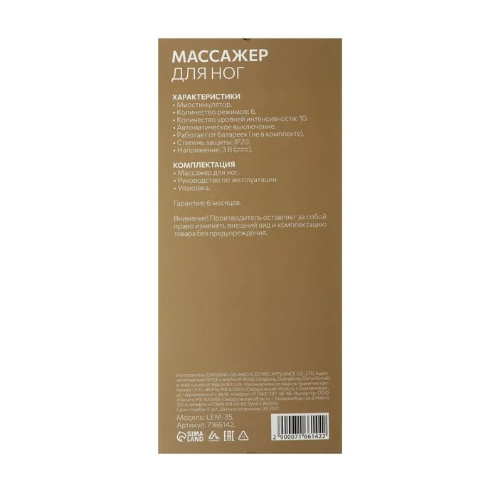 Массажёр для ног Luazon LEM-35, миостимулятор, 6 режимов, 2хААА (не в компл.), чёрный — Характеристики