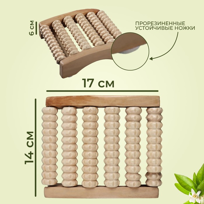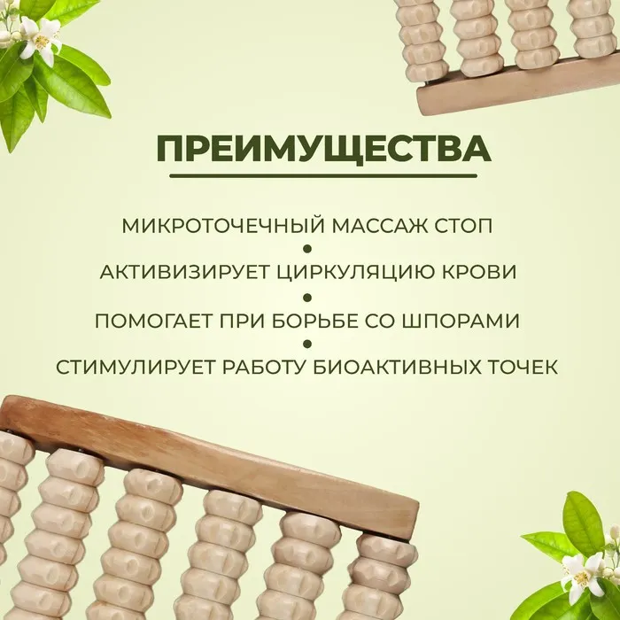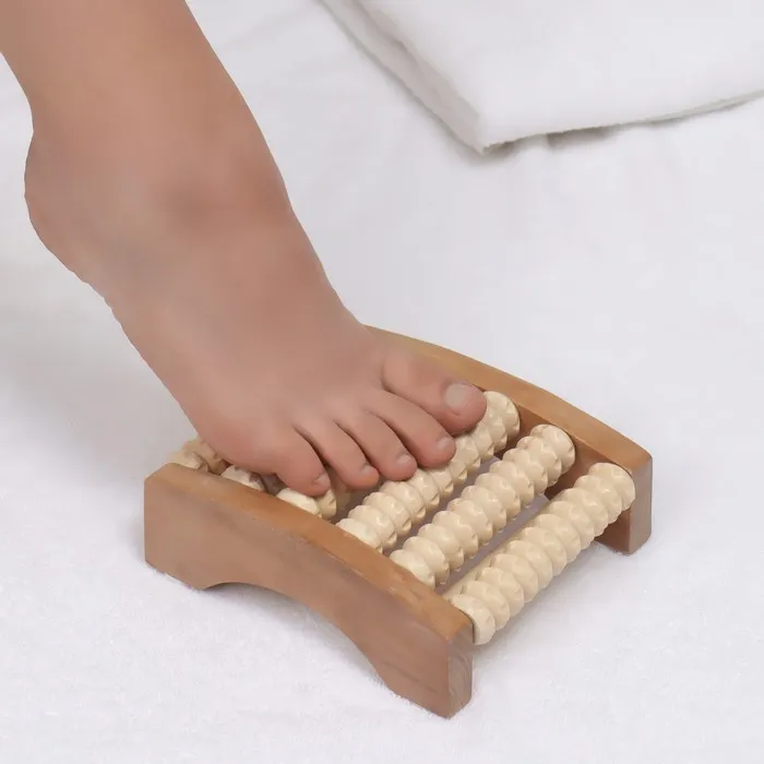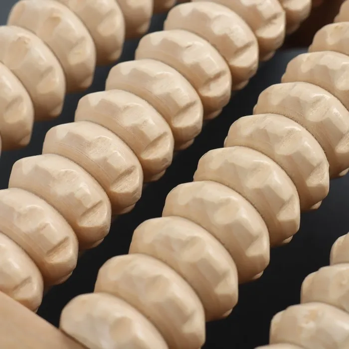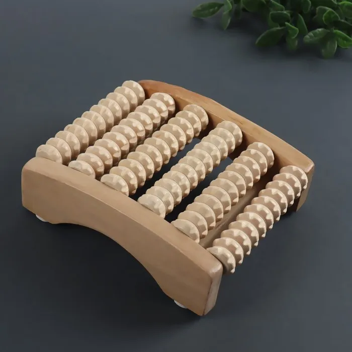 Массажёр отлично подойдёт для расслабления мышц ножек после активного дня и физических нагрузок. Он улучшает кровообращение, убирает отёки и успокаивает благодаря деревянным барабанам с шипами.