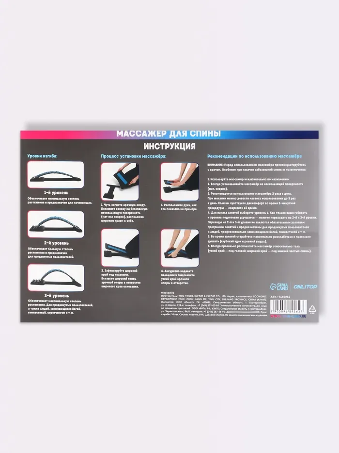 Изделие рекомендуется устанавливать на твёрдой поверхности. Четырёхуровневая конструкция позволяет использовать массажёр как новичкам, так и профессионалам. Начинать всегда следует с первого уровня, поднимая высоту мостика по мере привыкания. Это позволит избежать дискомфорта, расслабиться и получать удовольствие во время процедуры. Используйте массажёр по 5–10 минут 1–2 раза в день. После немного полежите на кровати или лягте спать.
