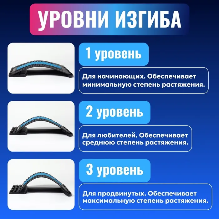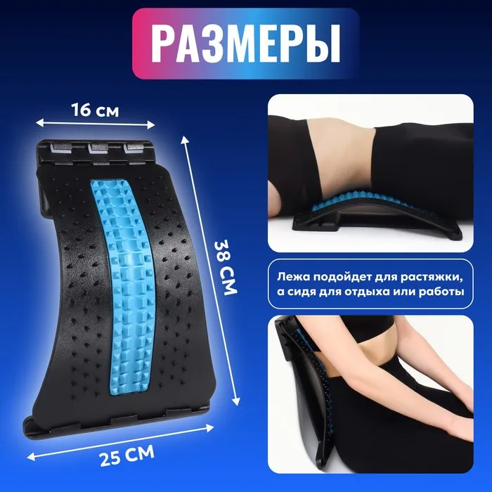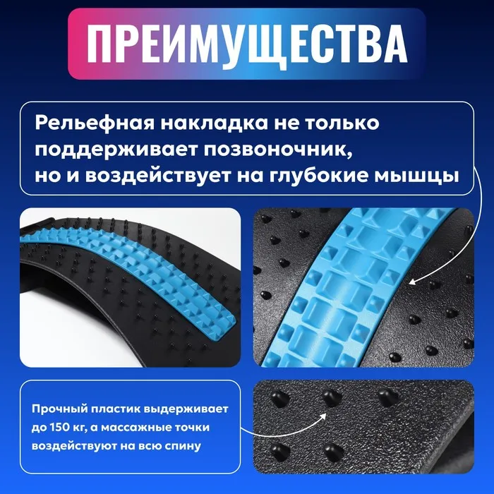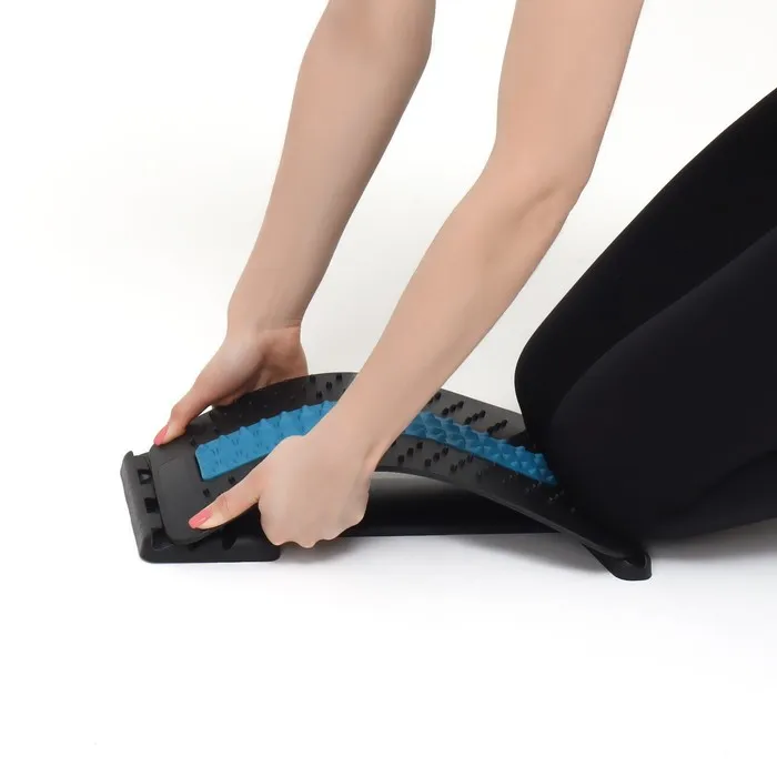 Массажный мостик служит для расслабления, снятия напряжения и боли в спине и пояснице. Он мягко растягивает спину, устраняет межпозвоночные зажимы, повышает гибкость, улучшает осанку и, как следствие, походку. Шипы по краям массажёра воздействуют на спинные мышцы по типу акупунктурного коврика. Мягкая вставка посередине защищает позвоночник от травм.