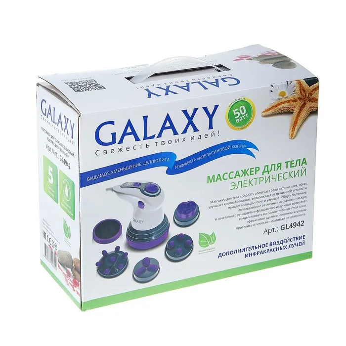 Массажёр Galaxy GL 4942 снимет усталость, придаст тонус мышцам всего тела и избавит от целлюлита. Прибор имеет 5 уникальных насадок и 2 режима работы для разного воздействия на необходимый участок. Также он оснащён функцией инфракрасного подогрева. Благодаря эргономичному корпусу устройства вы проведёте процедуру без неудобств и напряжения.