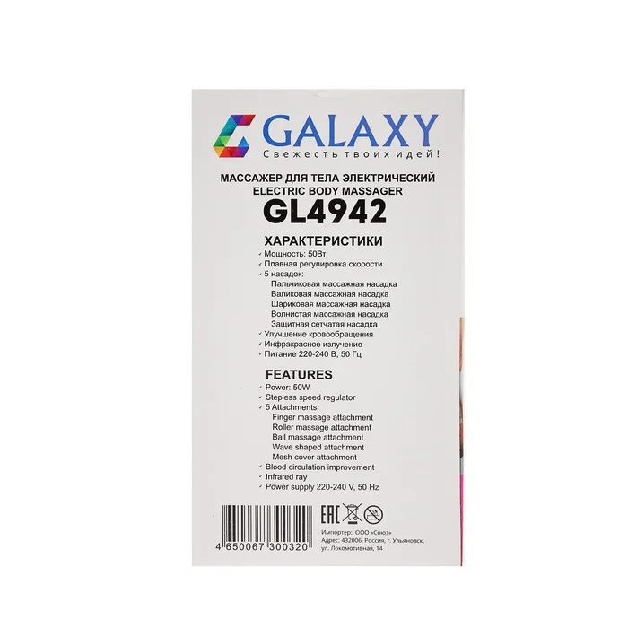 Массажёр для тела Galaxy GL 4942, электрический, 50 Вт, 5 насадок, 3 скорости, 220 В, фиолет. — Характеристики