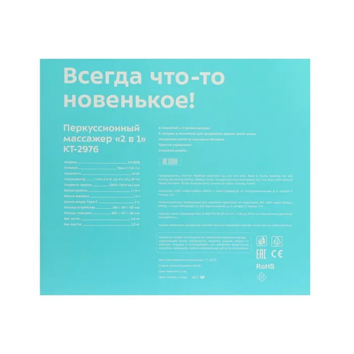 Массажёр для тела Kitfort КТ-2976, электрический, перкуссионный, 24 Вт, 6 насадок, чёрный — Характеристики