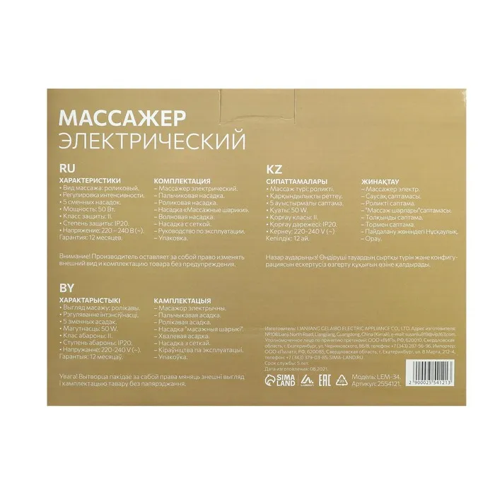 Массажёр для тела Luazon LEM-34, антицеллюлитный, 2 режима, 5 насадок, 220 В, белый — Характеристики