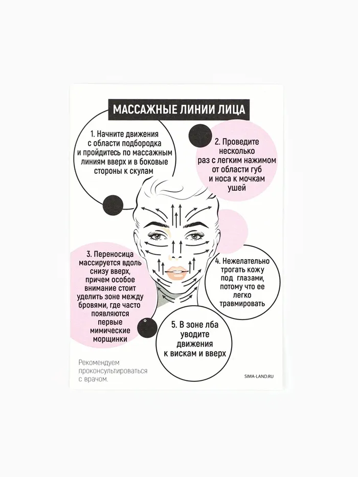 Способ применения: очистите лицо, нанесите увлажняющую сыворотку или масло. Возьмите массажёр и начните мягко нажимать на него. Двигайтесь по массажным линиям по 3 раза.