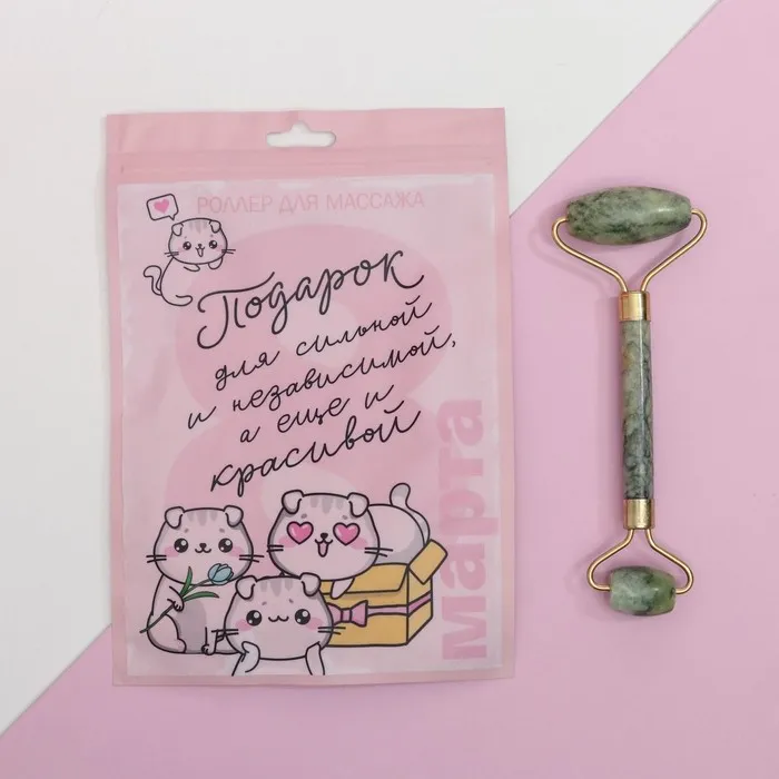 Роликовый массажёр сделан из натуральных камней – кальцита и серпентина. Ролик помогают снять отёчность лица, уменьшить количество морщин, подтягивает кожу, тонизирует её.