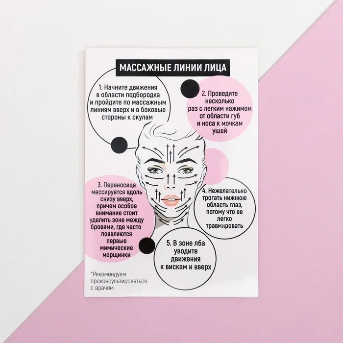 Способ применения: очистите лицо, нанесите увлажняющую сыворотку или масло. Возьмите массажёр и начните мягко нажимать на него. Двигайтесь по массажным линиям по 3 раза.