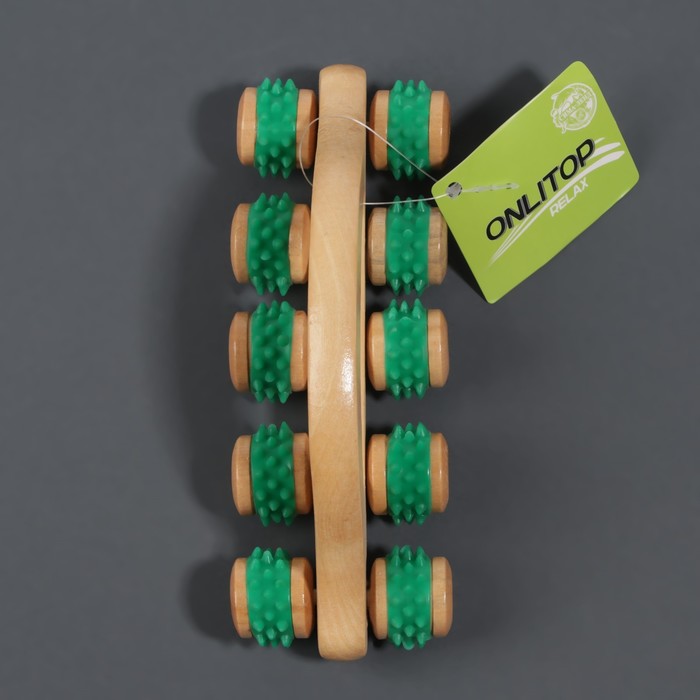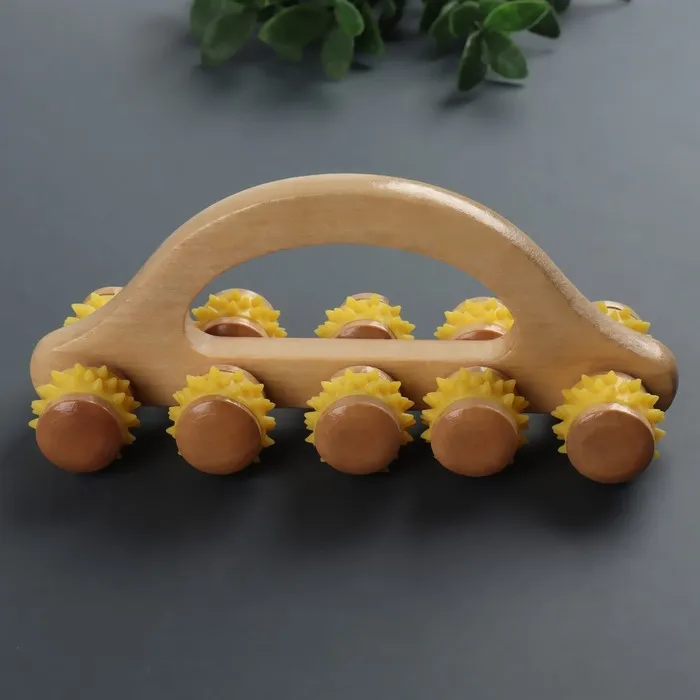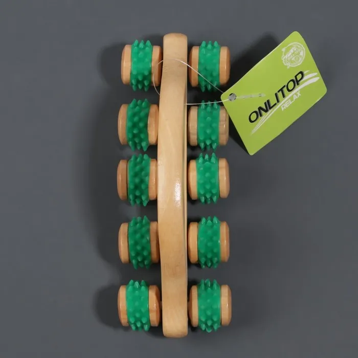 Массажёр с шипами «Гусеница», 18×6×7 см, универсальный, деревянный, с ручкой, 10 колёс, МИКС