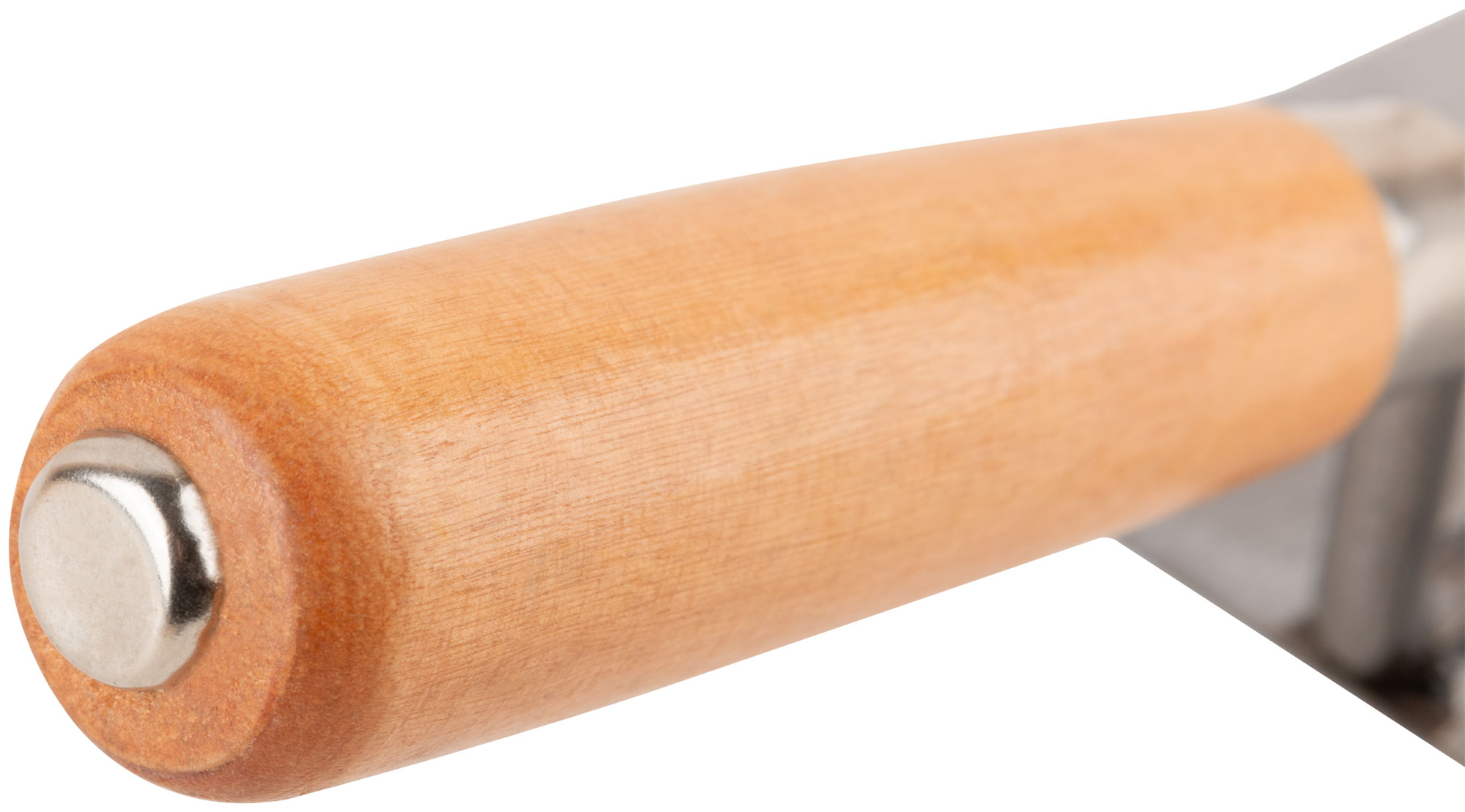 Изготовлен из инструментальной стали, обеспечивающей долговечность и стойкость к износу. Деревянная ручка удобна для длительного использования, снижает усталость рук. Габариты 335x120 мм обеспечивают оптимальный охват рабочей зоны.