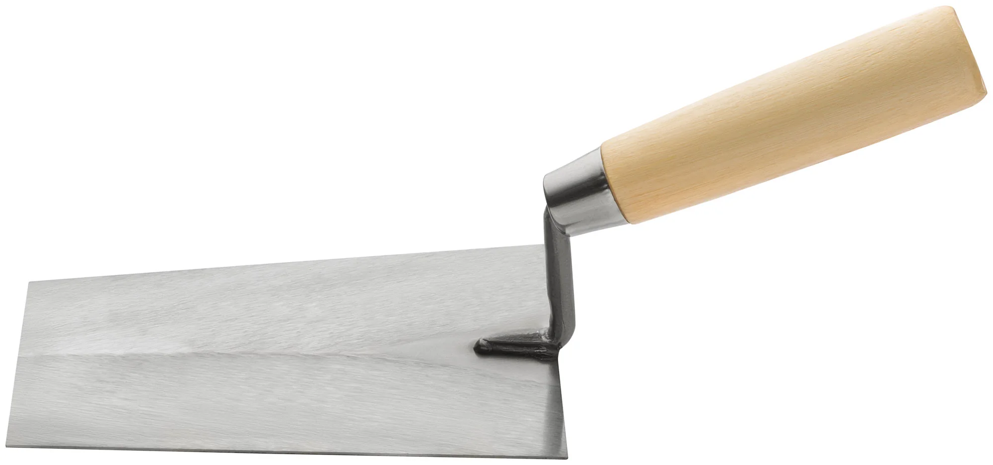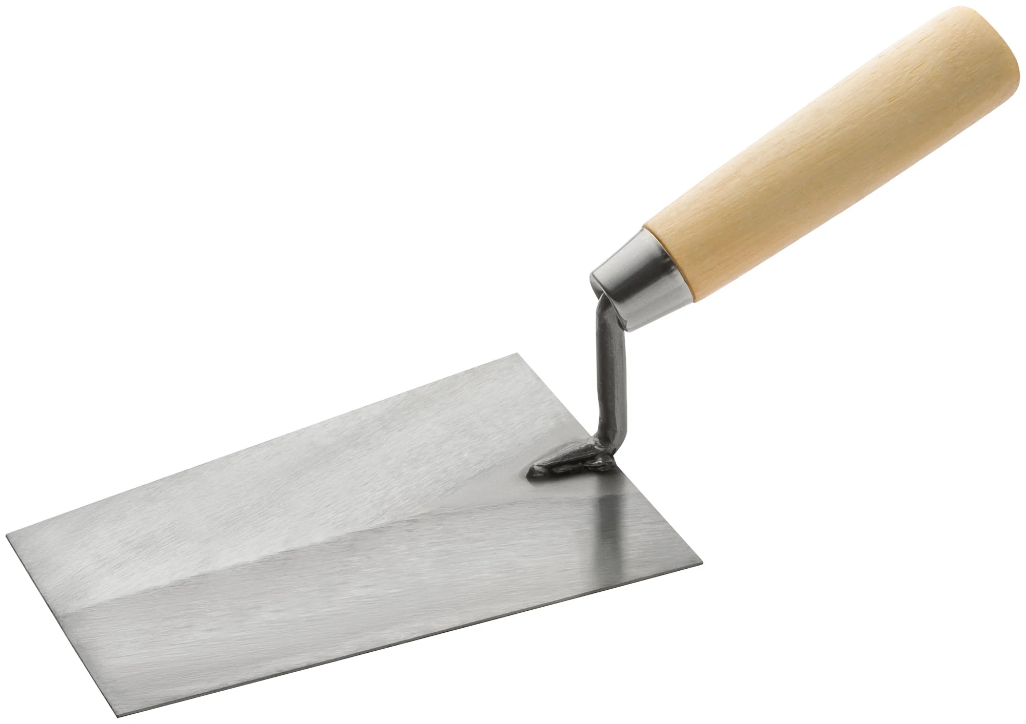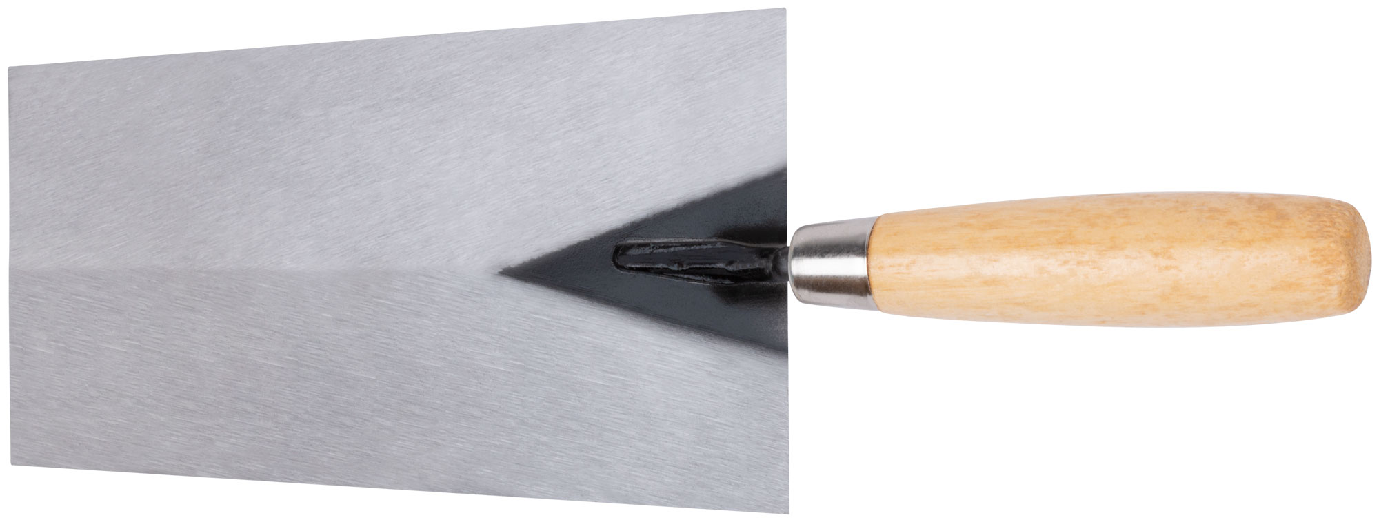 Мастерок изготовлен из прочной инструментальной стали, что гарантирует его долговечность и надежность. Деревянная ручка обеспечивает комфортный хват, снижая усталость при длительной работе.