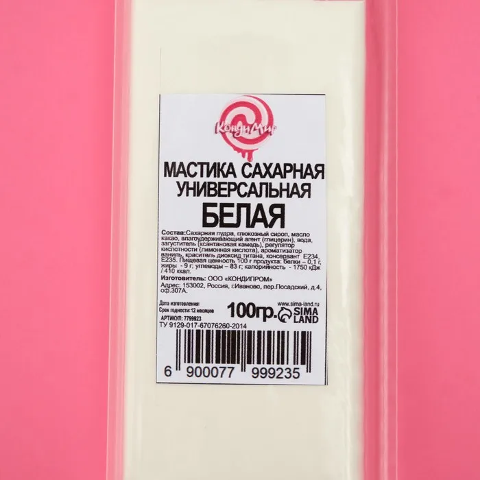 Способ применения: разогреть в руках необходимое количество мастики, размять на сухой, слегка подпыленной крахмалом поверхности (во избежание прилипания) до мягкой пластичной консистенции. По желанию добавить краситель или смешать с мастикой другого цвета, использовать для декорирования или лепки.