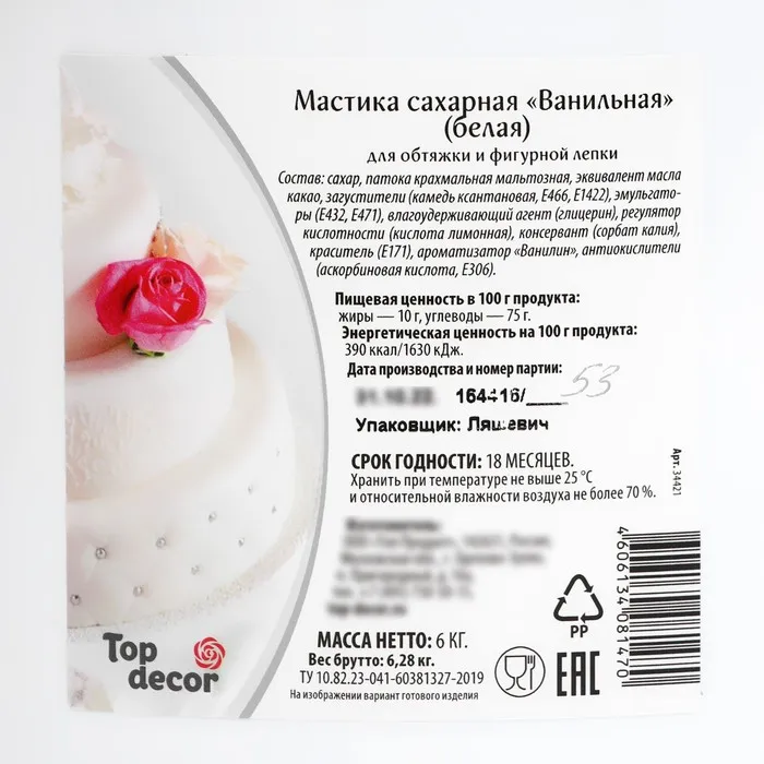 Способ применения: разогреть в руках необходимое количество мастики, размять на сухой, слегка подпыленной крахмалом поверхности (во избежание прилипания) до мягкой пластичной консистенции. По желанию добавить краситель или смешать с мастикой другого цвета, использовать для декорирования или лепки.