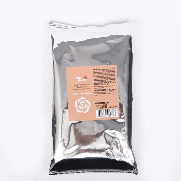 Способ применения: перед использованием рекомендуется размять необходимое количество мастики до получения мягкой пластичной консистенции на сухой, слегка подпыленной крахмалом поверхности; изготовить элемент декора.