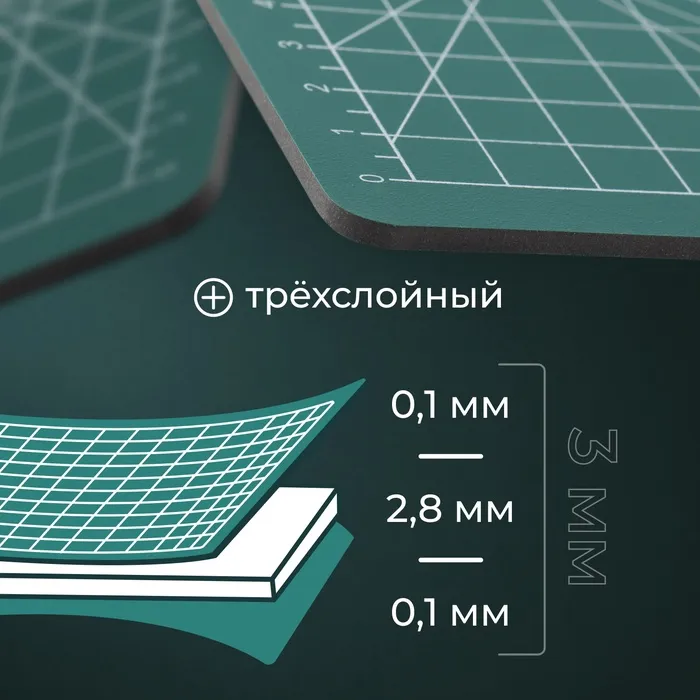 Трёхслойная конструкция: мат для резки состоит из трёх слоёв, что обеспечивает его прочность и долговечность.