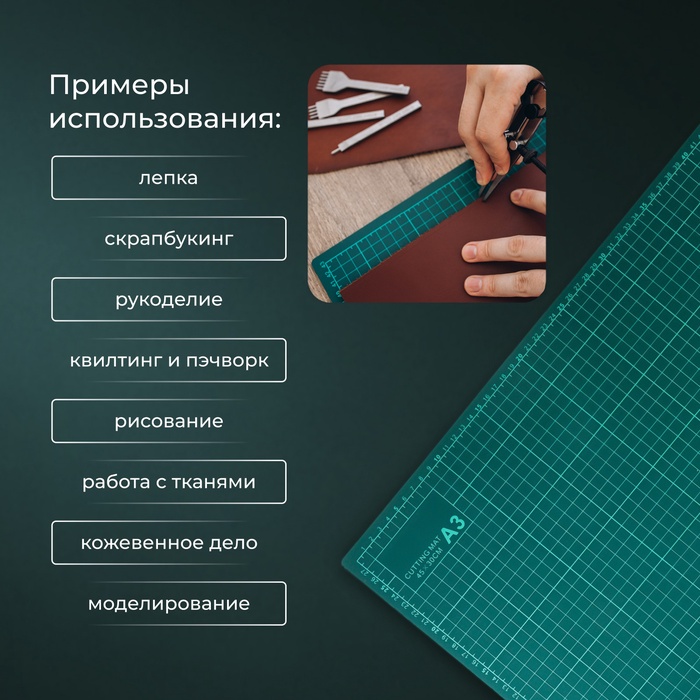 Защитный и противоскользящий: защитный слой обеспечивает долговечность и сохранность рабочей поверхности, предотвращая её износ от ножей и лезвий. Благодаря противоскользящей основе материал устойчиво располагается на рабочей поверхности, что делает процесс резки более безопасным.