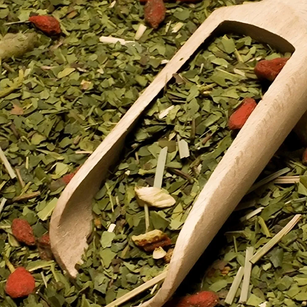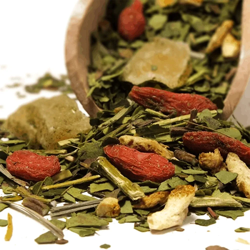 Ингредиенты: зеленый мате-чай (не содержит стеблей/веток), ягоды годжи, лимонник, кубики ананаса, апельсиновая цедра, мята, натуральные ароматы.