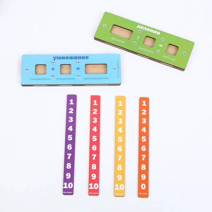 - Начните с умножения. Вставьте плашки из дерева в основу так, чтобы цифры оказались в окошках.