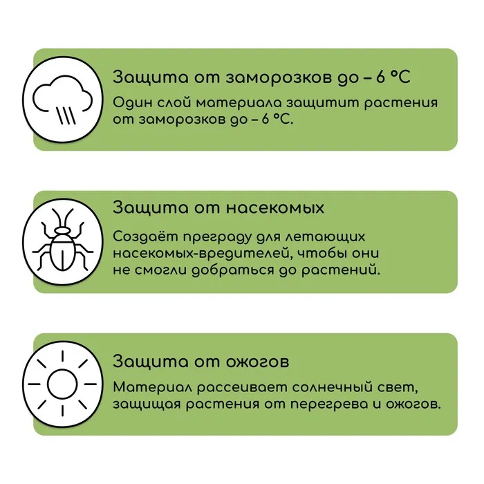 Защищает от заморозков, ожогов, перепадов температуры, осадков и насекомых.