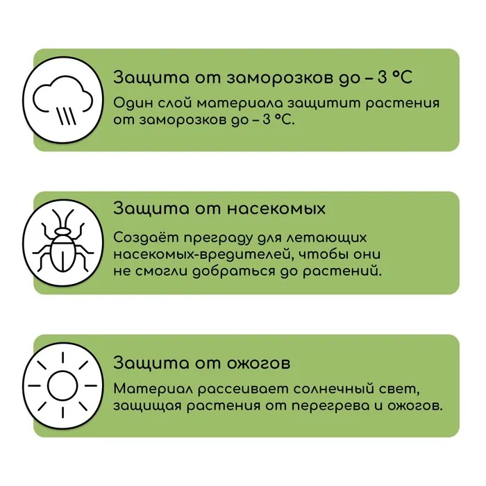 Защищает от заморозков, ожогов, перегревов, осадков и насекомых.
