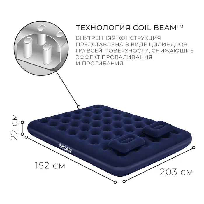 Матрас надувной Pavillo, 203 х 152 х 22 см, ручной насос, 2 подушки, 67374 Bestway — Характеристики