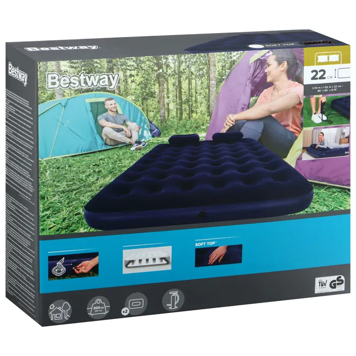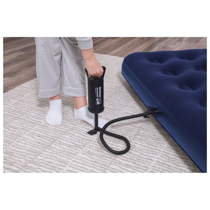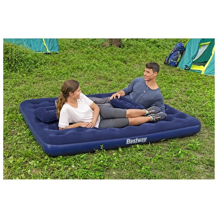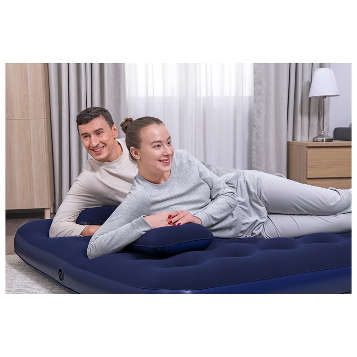 Когда нужно разместить гостей, но в доме нет лишнего спального места, вас выручит надувной матрас. Прочные перегородки внутри обеспечивают необходимую упругость. Насос в комплекте упрощает процесс установки. С велюрового покрытия, приятного на ощупь, не скатывается постельное бельё. Изделие имеет сдержанный дизайн, классическая расцветка позволяет ему хорошо вписываться в любой интерьер. Данную модель можно назвать настоящей надувной кроватью, так как она не уступает в комфорте обычным пружинным матрасам. Подходит также для использования на открытом воздухе.