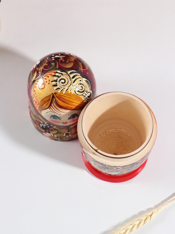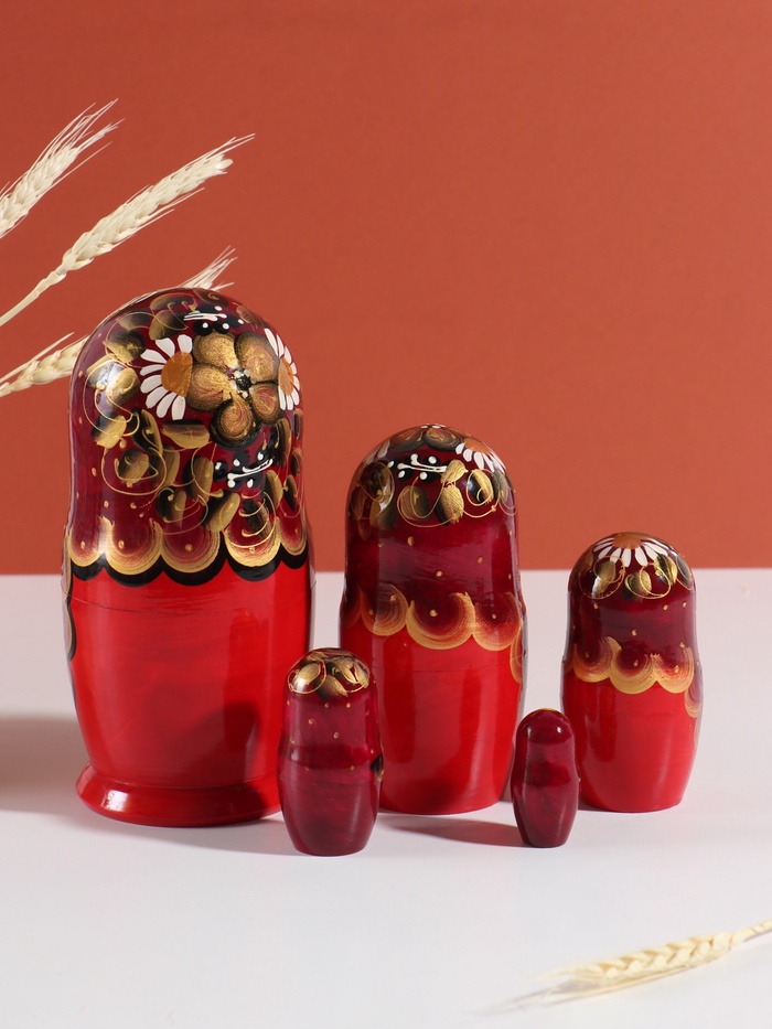 Высота главной куклы — 19 см — делает её идеальным размером для демонстрации на полке или в качестве подарка. Роспись выполнена вручную, что делает этот набор уникальным и неповторимым. Цветочные мотивы добавляют изделию лёгкость и изящество, превращая его в настоящий акцент любого интерьера.