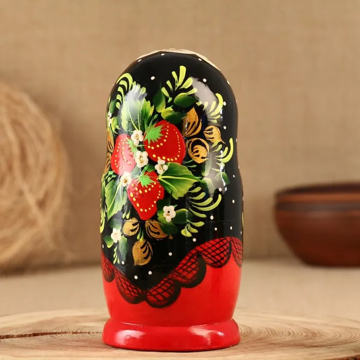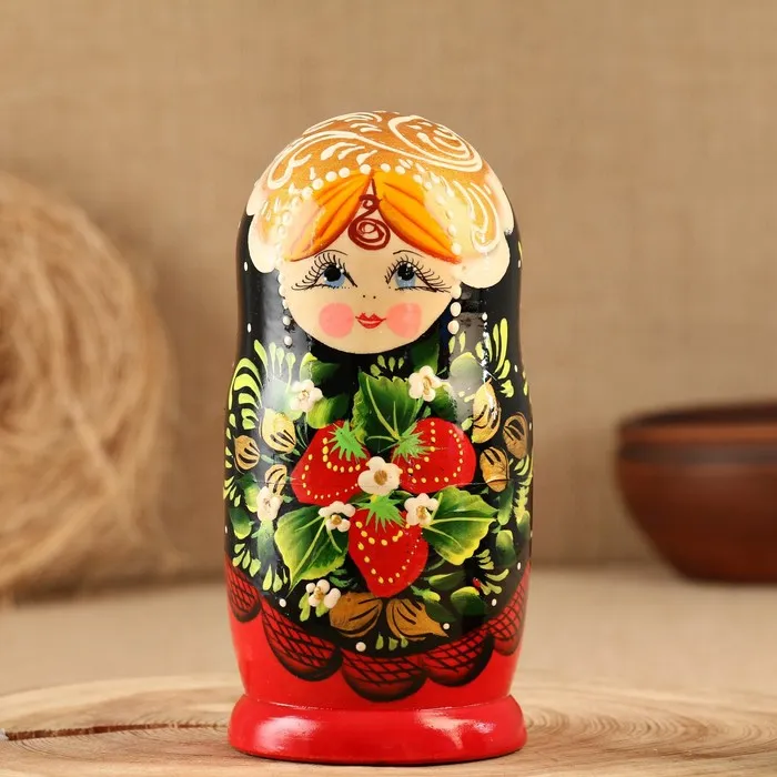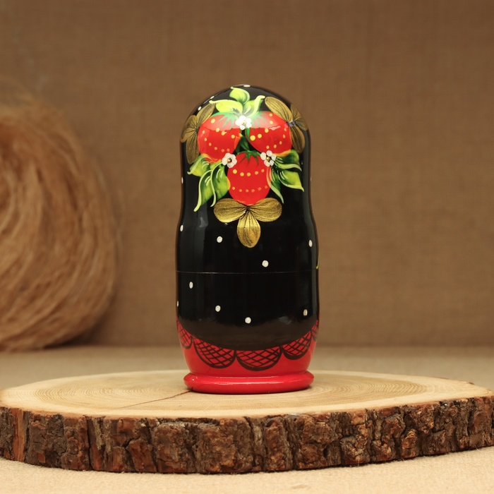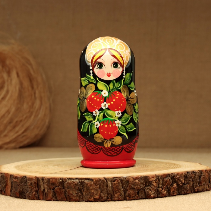 Матрёшка дерево «Земляничка», чёрный платок, 5 кукольная, 18 см — Характеристики