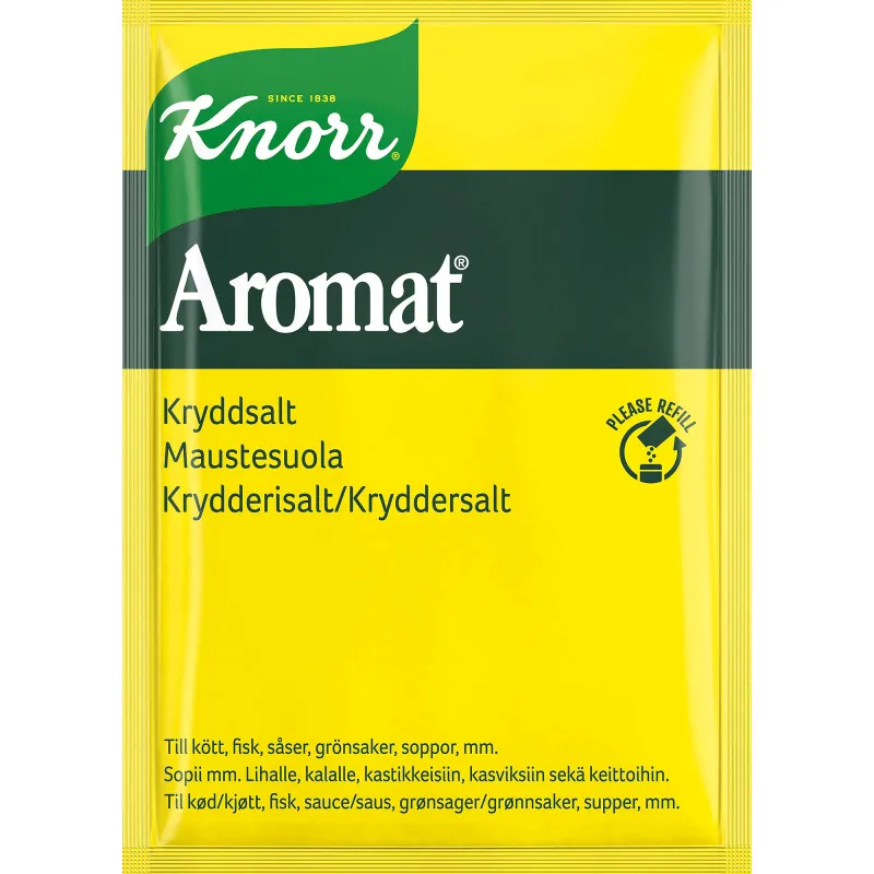 Knorr Aromat – универсальная ароматизированная соль, идеально подходящая для различных блюд. Используйте ее как при приготовлении пищи, так и в качестве столовой приправы: она отлично сочетается с мясом, рыбой, супами, соусами, рагу, а также с вареным картофелем или яйцами. Ароматизированная соль подчеркивает и улучшает вкус ваших блюд. Упаковка 90 г. Для удобства использования и хранения можно пересыпать содержимое пакета в солонку или баночку для специй.