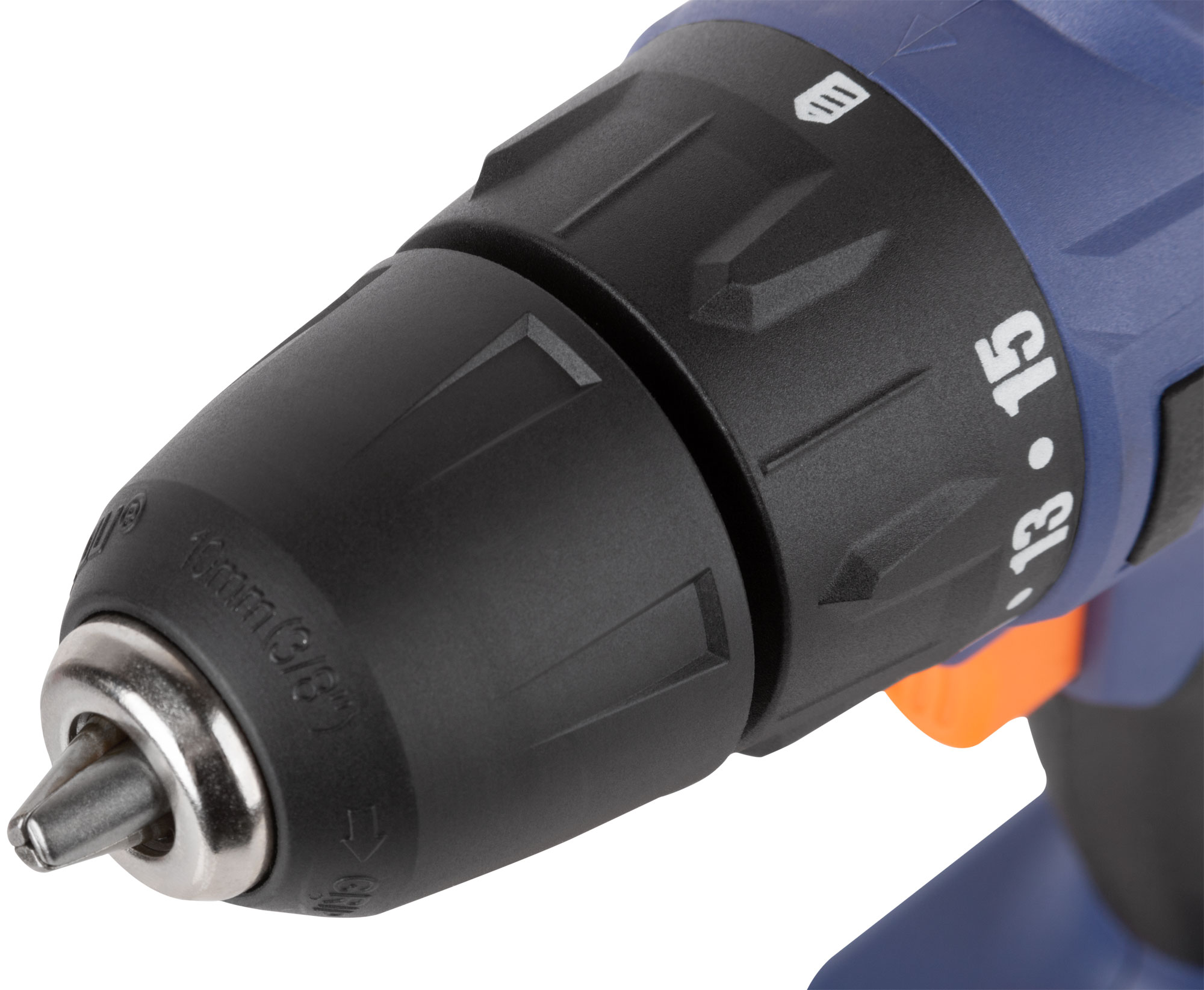 Дрель-шуруповерт оснащена быстрозажимным патроном 10 мм, что облегчает смену насадок. Две Li-Ion батареи емкостью 1,5 Ач обеспечивают длительное время работы без подзарядки, а быстрая зарядка всего за 1 час позволяет минимизировать простои.