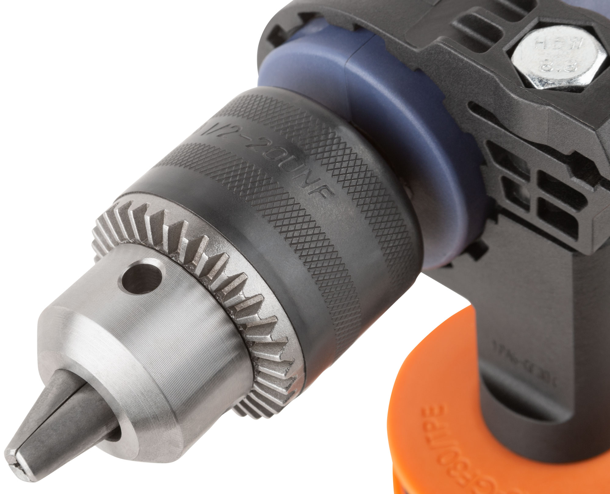 Эта дрель оснащена ключевым патроном размером 1,5-13 мм, что делает её универсальной для различных сверл. Антивибрационная ручка и резиновые вставки обеспечивают комфортное использование даже при длительной работе.