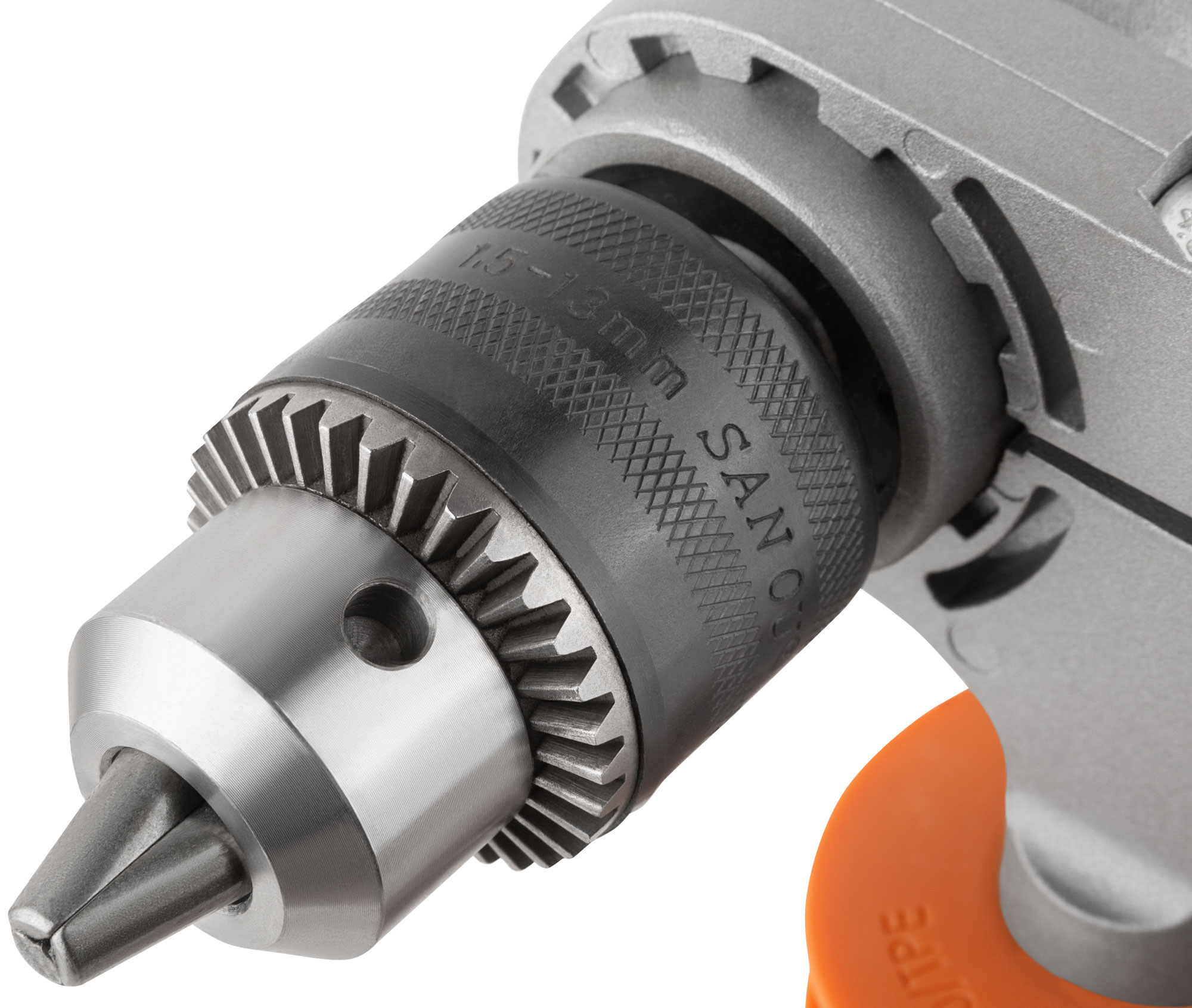 Дрель оснащена ключевым патроном размером от 1,5 до 13 мм, что позволяет использовать широкий спектр насадок. Металлический корпус редуктора обеспечивает долговечность и надежность инструмента, а резиновые вставки и антивибрационная ручка снижают нагрузку на руки и повышают комфорт в работе.